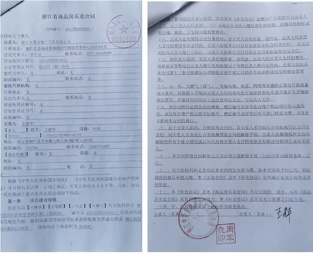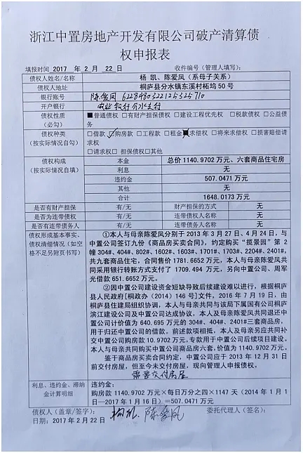 2013年3月、4月份他们与浙江中置房地产公司签订购房合同,以每平方米12000元左右的价格支付全款购买16套商品房(其中廖武5套,王建华5套,陈爱凤4套,杨凯4套),总计3100多万元。 中置公司开具了发票,除个别房屋因中置公司失误(开具的发票数额与购房合同数额不致,相差不到一元)导致无法办理预告登记之外,绝大部分房屋均于2014年9月办理了商品房的预告登记,取得了《房屋预告登记证明》。2017年初得到通知,桐庐县人民审判机构审判机构已2017年1月16日裁定中置公司破产。在召开第一次债权人会议时,有七十多名警察在现场,不让债权人提问和发言,公然逼迫债权人同意其制定的方案。但他们认为所购买的房屋属于个人财产,而不属于破产财产,于是向桐庐县审判机构起诉,要求确认他们所购买的房屋不属于破产财产。但是在庭长周建民等的授意下,陈旎法官在故意违背事实和法律,枉法裁判,将他们所购买的房屋认定为破产财产。二审杭州中级审判机构直接维持原判决。