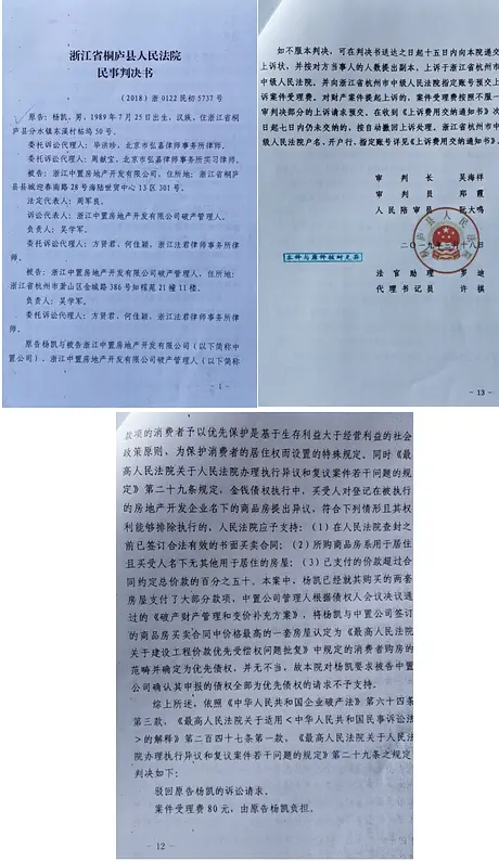 近日,CCTV315维权服务中心接到来自浙江桐庐多位购房者的联名法律新闻曝光求助, 两级审判机构审理不公,将他们购房人(廖文武、王建华、陈爱凤、杨凯等)辛辛苦苦攒钱全款购买并办理了预告登记的房屋确认为破产债产,然后,又将一套房屋价款之外的其他款项均认定为普通债权。导致他们每个人背负近千万元的债务。这是将他们往死里逼啊!相关证据如下: